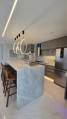 O imóvel possui marcenaria planejada na cozinha e banheiros, pronta para morar.
